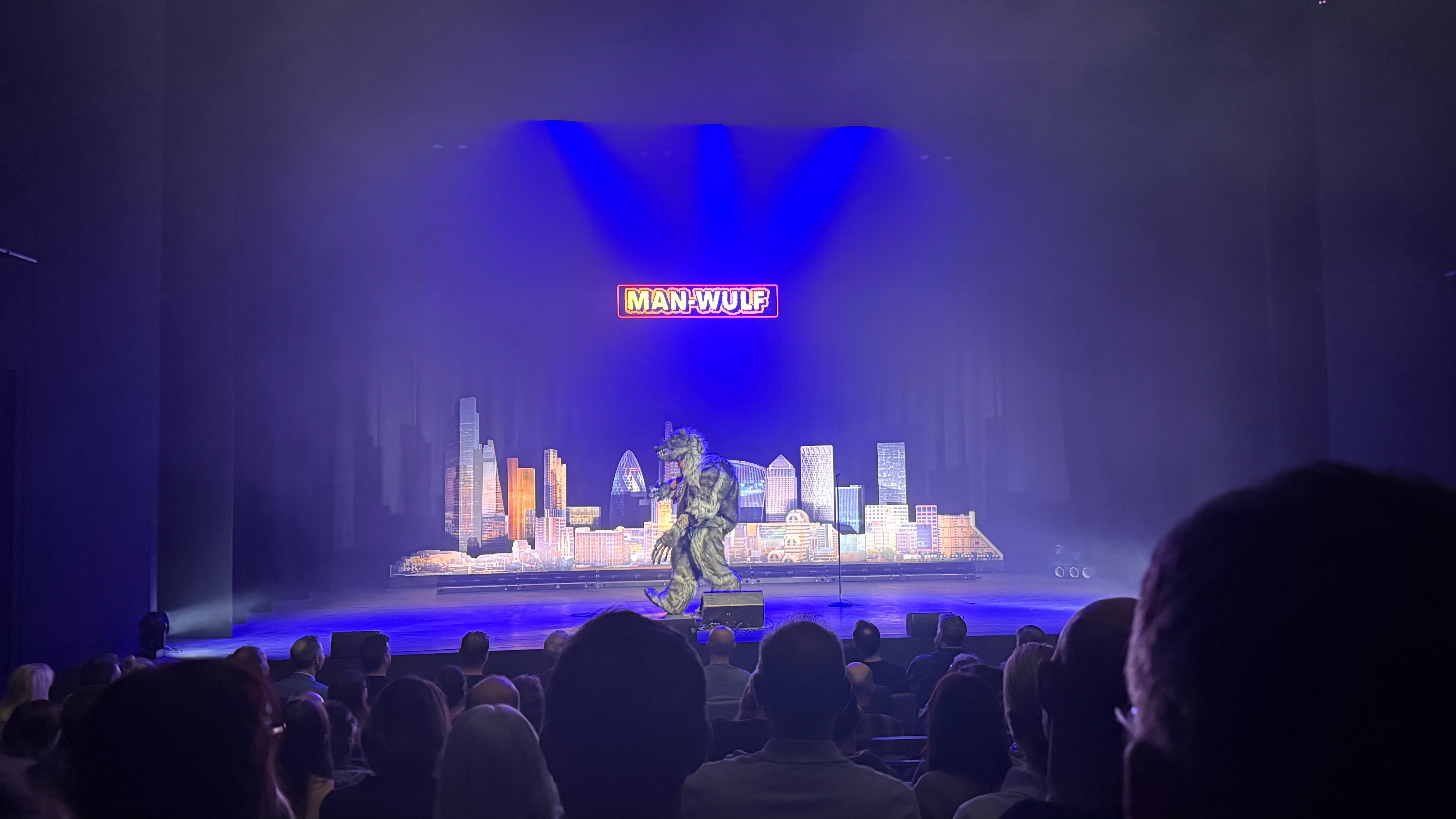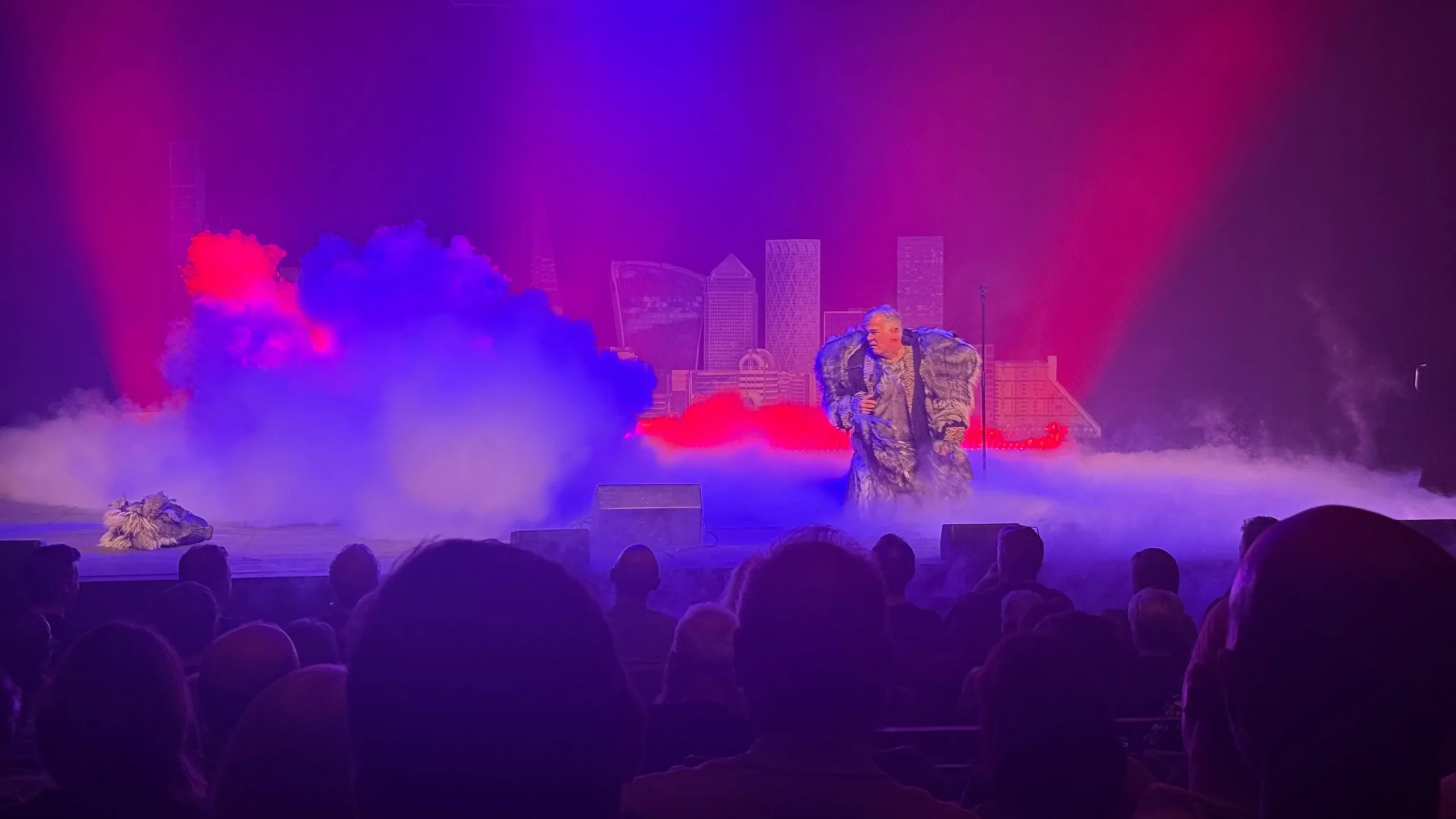 And if nothing else it’s time for the tech team to have fun with the smoke machine and the lights. And a very big prop callback to Gregg Wallace, with his head like a massive moon. But not on a stick. If you’ve ever watched a Netflix comedy special, you’ll have a sound idea of whats coming next, though I find myself thinking of Jim Jeffries a lot here, with the voice Columbo gargling battery acid. Dressed as a furry, or the Honey Monster gone reeeeeal baaaad. he runs through the typical tempate edgelord comedy routine with all the usual targets, “ya know who I hate…?”. But then there’s another transition [cue fx], and suddenly we have a man in a furry suit asking if he’s said anything embarrassing.